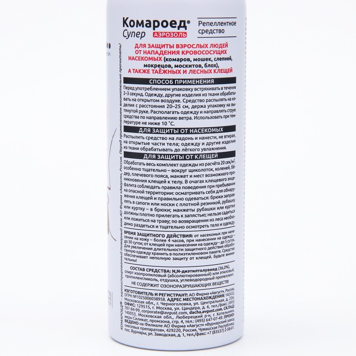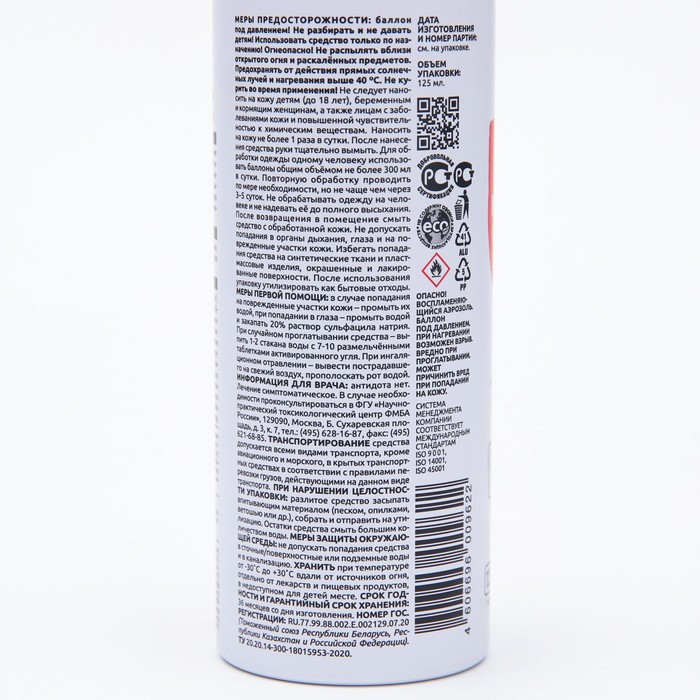 Описание: аэрозоль от кровососущих насекомых (комаров, мошек, слепней, клещей и др.) во время отдыха на природе, прогулок в лесу. Можно наносить на одежду и на кожу. Защита не менее 4-х часов.
