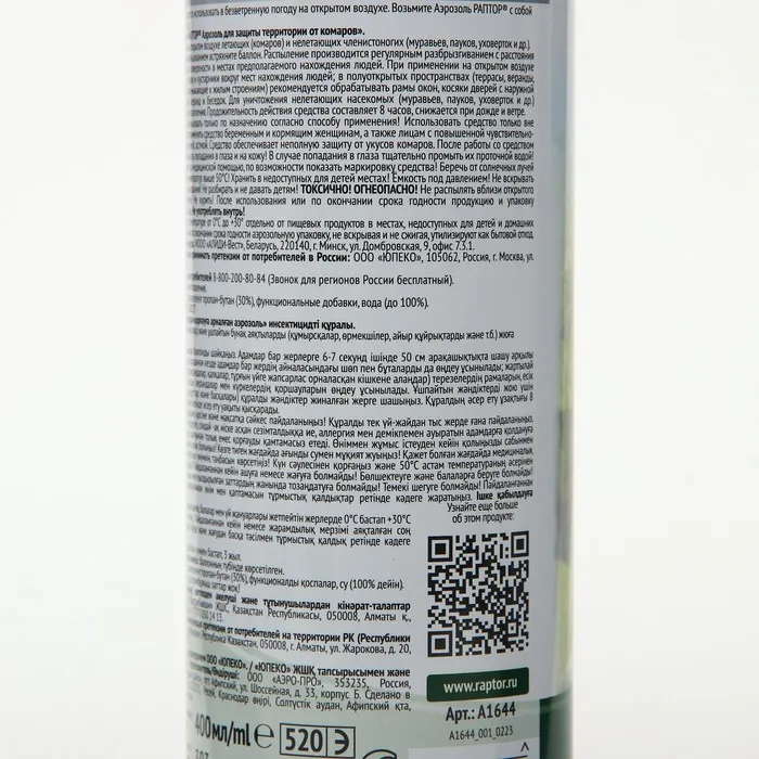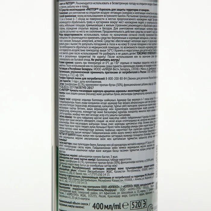 Аэрозоль Репеллент «Раптор», от комаров, 400 мл — Характеристики
