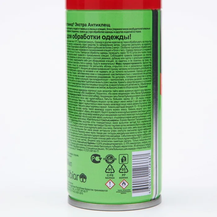 Рефтамид Экстра Антиклещ, Средство от лесных клещей, 100мл. Рефтамид экстра антиклещ - инсектоакарицидное средство для защиты людей от таёжных и лесных клещей, блох (переносчиков возбудителей заболеваний человека). В состав средства от клещей введено новое активнодействующее вещество, которое значительно повышает эффективность защиты от клещей в сравнении с традиционными средствами. Репеллент наносится ТОЛЬКО на одежду и снаряжение. Способ применения: перед применением баллон встряхнуть. Одежду и другие изделия из ткани обрабатывать на открытом воздухе (в защищенном от ветра месте). Средство распылять на изделия с расстояния 20–25 см. Общее время обработки брюк и рубашки не более 2 минут. Особенно тщательно обрабатывать одежду вокруг щиколоток, голеней, коленей, бедер, плечевого пояса и мест возможного проникновения клещей и блох к телу. Время защитного действия: от клещей и блох до 15 суток. Повторную обработку одежды проводить через 10–15 суток или после стирки. Если вы любите проводить время на природе или работаете в лесном хозяйстве, то Рефтамид экстра антиклещ - это незаменимый помощник в борьбе с клещами и другими насекомыми.Составальфациперметрин 0,20%, имипротрин 0,15%, нефрас, отдушка, вспомогательные компоненты, углеводородный пропеллент