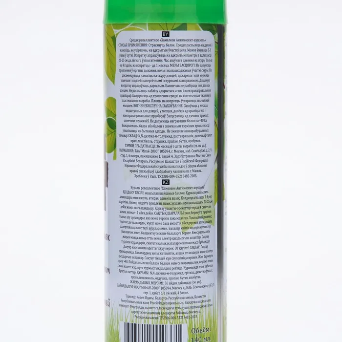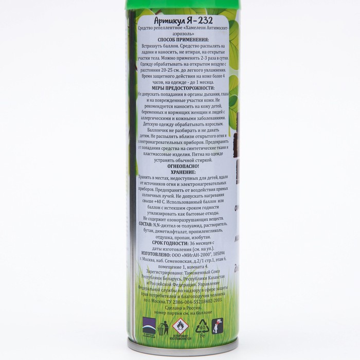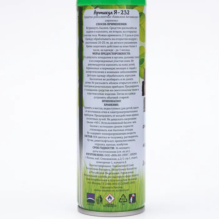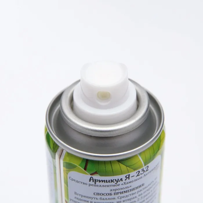 Меры предосторожности: не допускать попадания в органы дыхания, глаза и на поврежденные участки кожи. Не рекомендуется наносить на кожу детей, беременных и кормящих женщин и людей с аллергическими и кожными заболеваниями. Детскую одежду обрабатывать взрослым. Баллончик не разбирать и не давать