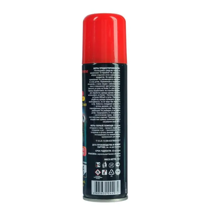 Описание:Для защиты людей от нападения кровососущих насекомых (комаров, мокрецов, москитов, мошки, слепней) при нанесении на открытые части тела. EXTREME АЭРОЗОЛЬ идеально подойдет для защиты от насекомых в экстримальных условиях: на рыбалке, охоте, отдыхе, в лесу, в тайге, в горах, в районах с повышенной влажностью.Способ применения:Средство тонким слоем без втирания нанести на открытые части тела - лицо, руки, ноги, шею. Время защитного действия от насекомых - до 6 часов. При необходимости обработку повторить. Действующие вещество: диэтилтолуамид (ДЭТА) - 32%