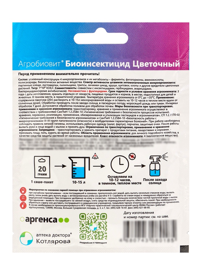 «Агробиовит Биоинсектицид Цветочный» — это биопрепарат для защиты декоративных, комнатных и балконных цветов от широкого спектра вредителей, таких как тля, паутинный клещ, трипсы, гусеницы, а также от некоторых грибковых заболеваний, работающий благодаря бактериям рода Bacillus thuringiensis и другим микроорганизмам. Он безопасен для людей, животных и полезной энтомофауны, действует контактно и кишечно, нарушая пищеварение вредителей и вызывая их гибель, при этом укрепляя иммунитет растений.