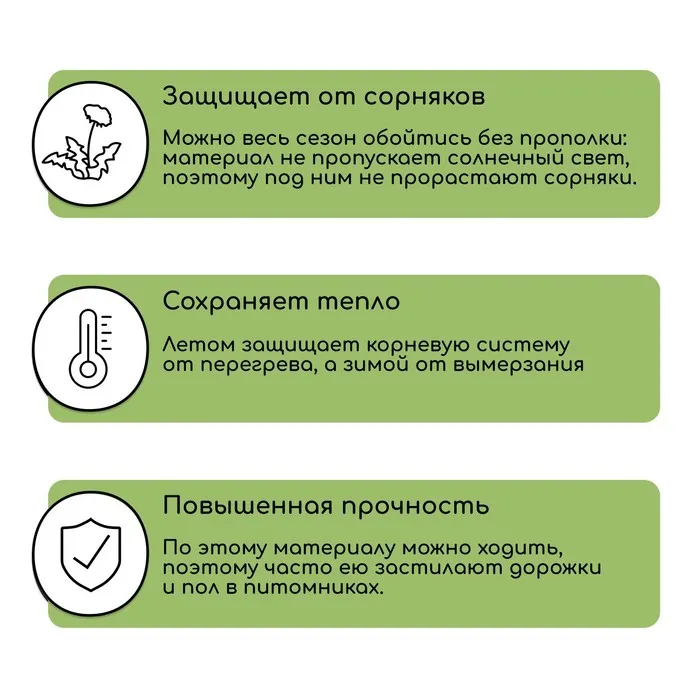 - Защищает от сорняков, так как не пропускает солнечный свет, нужный для роста растений.