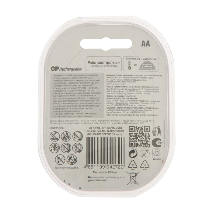 Аккумулятор GP, Ni-Mh, AA, HR6-2BL, 1.2 В, 1800 мАч, блистер, 2 шт. — Характеристики