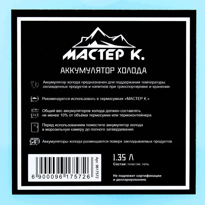 Аккумулятор тепла/холода, он же хладоэлемент и холодоаккумулятор, предназначен для поддержания высокой или низкой температуры в контейнерах из вспененных материалов, сумках-холодильниках и термопакетах. Он равномерно распределяет холод или тепло внутри термосумки, не протекает, обеспечивает долговременное охлаждение продуктов.