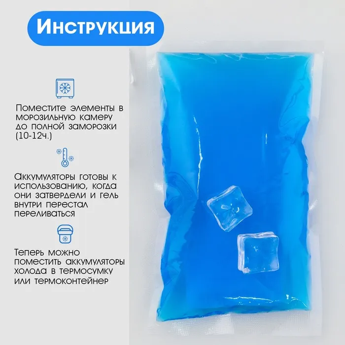 Аккумулятор тепла/холода, он же хладоэлемент и холодоаккумулятор, предназначен для поддержания высокой или низкой температуры в контейнерах из вспененных материалов, сумках-холодильниках и термопакетах. Он равномерно распределяет холод или тепло внутри термосумки, не протекает, обеспечивает долговременное охлаждение продуктов.