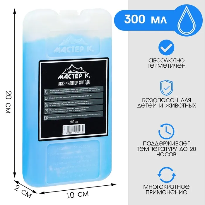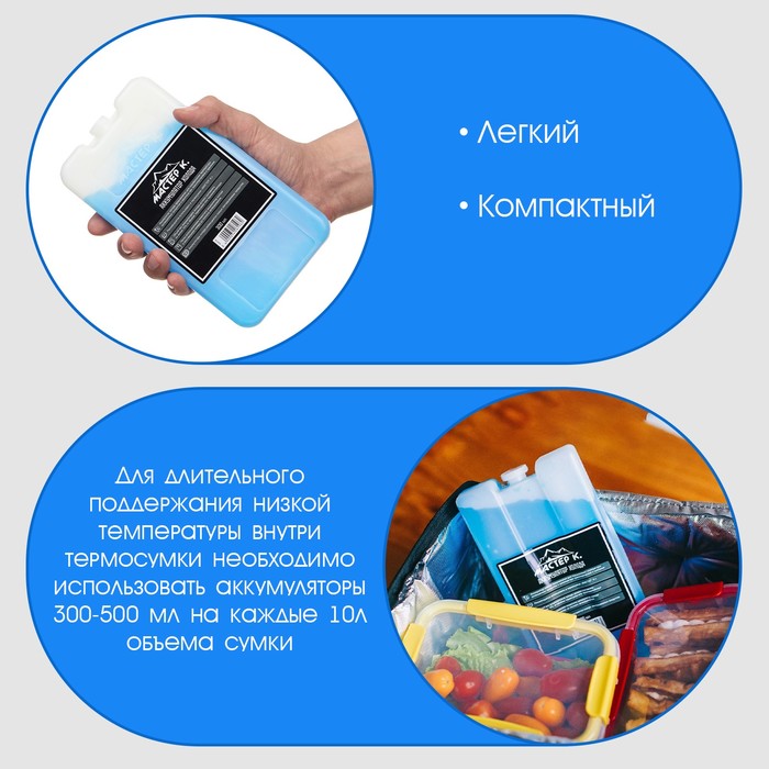 Аккумулятор тепла/холода, он же хладоэлемент и холодоаккумулятор, предназначен для поддержания высокой или низкой температуры в контейнерах из вспененных материалов, сумках-холодильниках и термопакетах. Он равномерно распределяет холод или тепло внутри термосумки, не протекает, обеспечивает долговременное охлаждение продуктов.