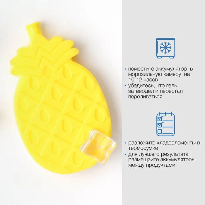 Маленький охладитель прост в использовании: достаточно поместить его в холодильник или морозилку на 8-12 часов. После этого терморегулятор разместить в термосумке, контейнере, сумке-холодильнике, термопакете или аптечке. Количество элементов, необходимых для охлаждения, зависит от объемов аксессуара. На каждые 10 литров необходимо использовать 300-500 мл охладителя.