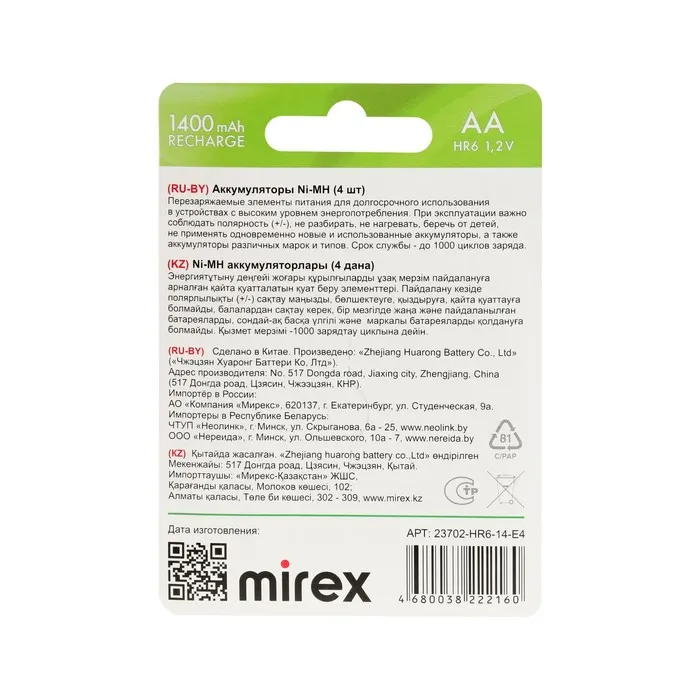 Аккумулятор Mirex Ni-Mh AA HR6-4BL — перезаряжаемые аккумуляторы для устройств, использующих батареи типа AA. Изготовлены с использованием технологии Ni-Mh (никель-металлогидрид), они обеспечивают стабильную работу в различных устройствах, таких как пульты ДУ, игрушки, радиоприемники и фотокамеры.