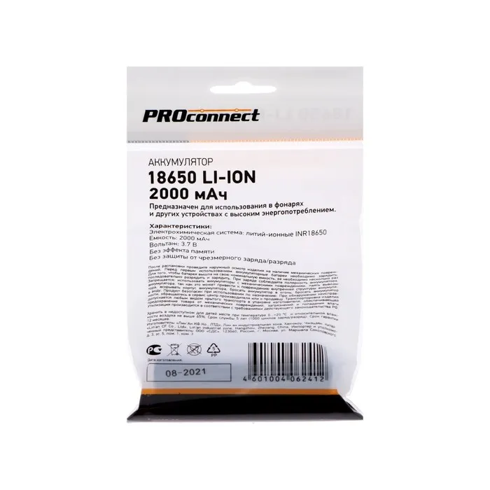 Аккумулятор REXANT, 18650 unprotected, Li-ion, 2000 мАЧ, 3.7 В, индивидуальная упаковка — Характеристики