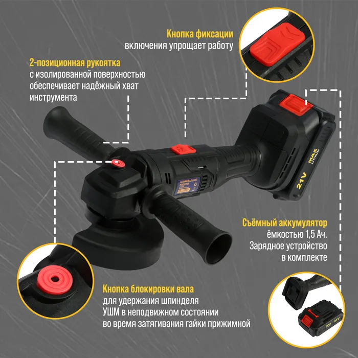 Аккумуляторная УШМ ТУНДРА, 21 В, 1.5 Ач, 100 х 16 мм, М10, 10 000 об/мин — Характеристики