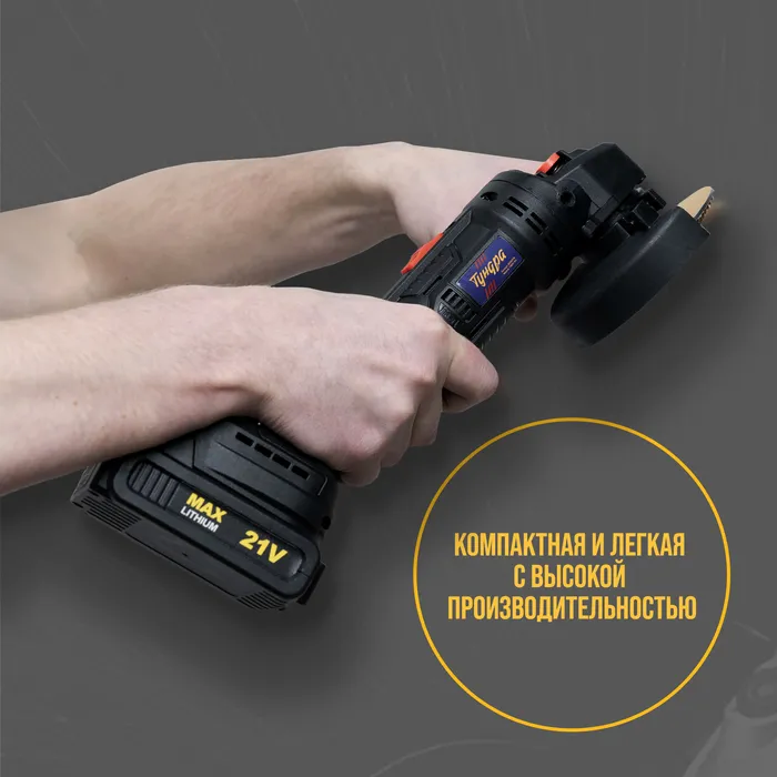 Аккумуляторная угловая шлифмашина TUNDRA 21 В — компактный и мощный инструмент для резки и шлифовки. С высокой скоростью вращения и мобильностью она подходит для работы в условиях, где важна маневренность.