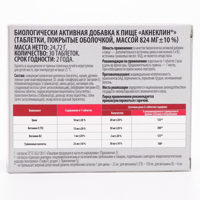 Биологически активная добавка к пище, в состав которой входит комплекс из пяти активных веществ. Вместе они общеукрепляюще действуют на организм и способствуют поддержанию хорошего состояния кожных покровов. Компоненты, входящие в состав бад, способствуют нормализации состояния кожных покровов, снижению воспалительных процессов, детоксикации организма, нормализации работы сальных желез.