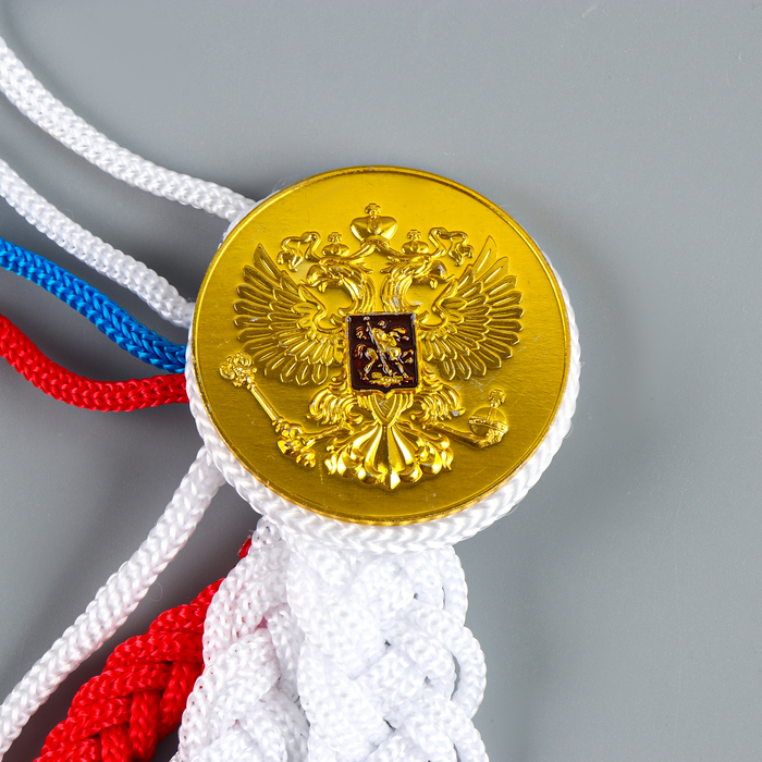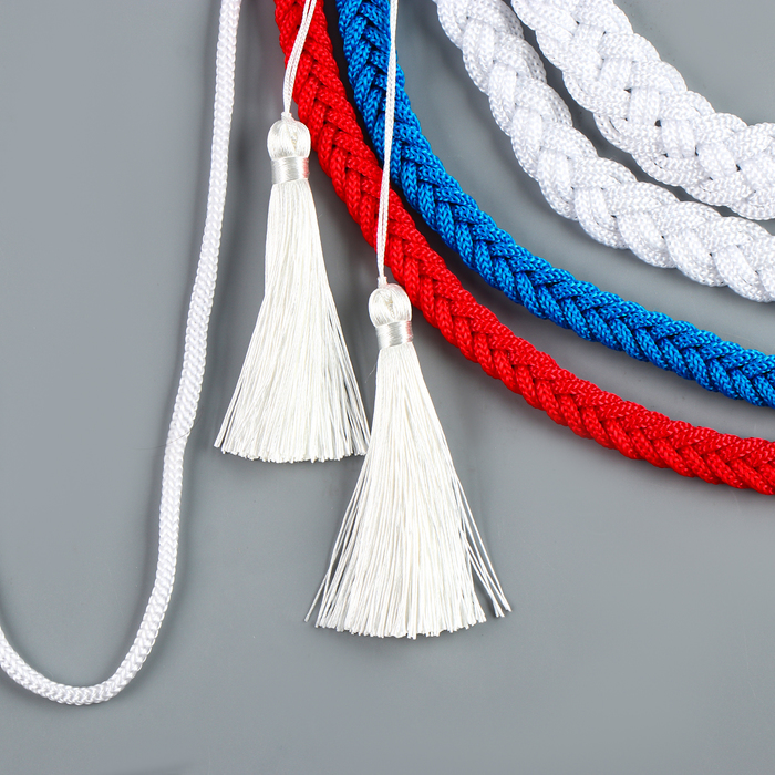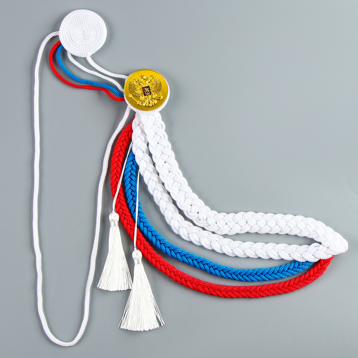 - Аксельбант украшен металлическим гербом — символом воинской доблести и чести. Яркие кисточки придают изделию праздничный вид.