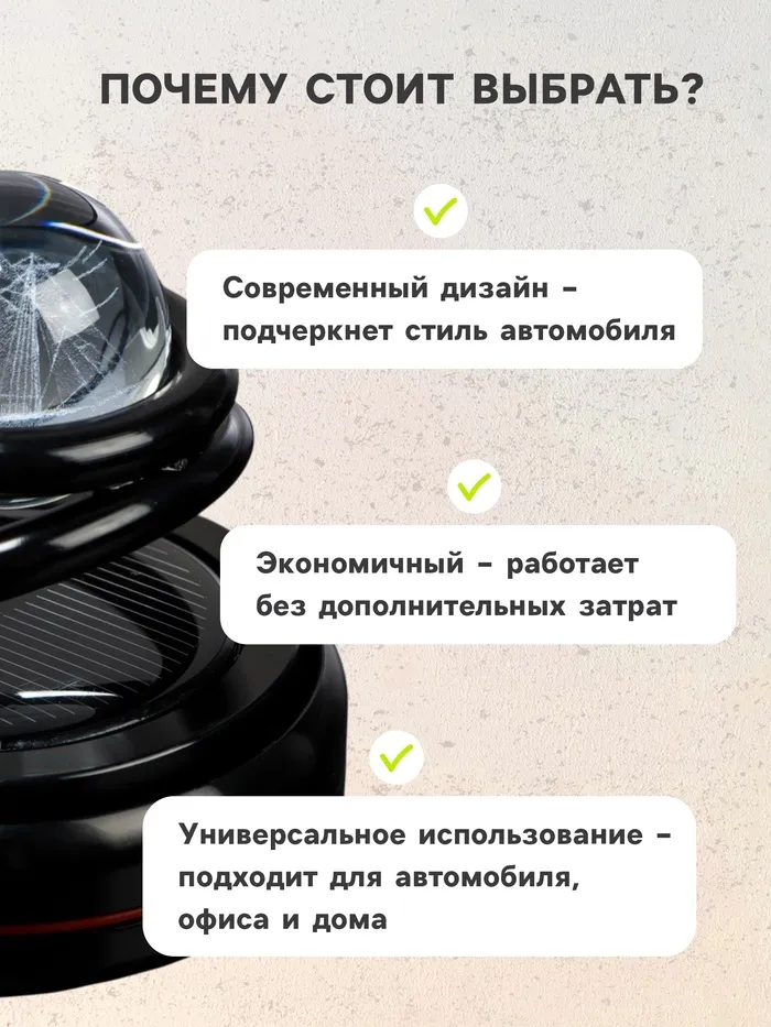 Главным преимуществом этого аксессуара является то, что он работает от солнечного света. Благодаря специальной технологии, кольца начинают вращаться при попадании на них солнечных лучей, создавая иллюзию движения галактики на панели вашего автомобиля.