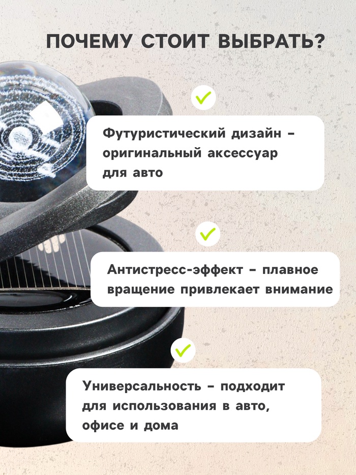Аксессуар для панели автомобиля с ароматизатором, гравитационные кольца вращающийся от солнечного света солнца - это уникальный и стильный элемент декора, который придаст вашему автомобилю неповторимый вид.