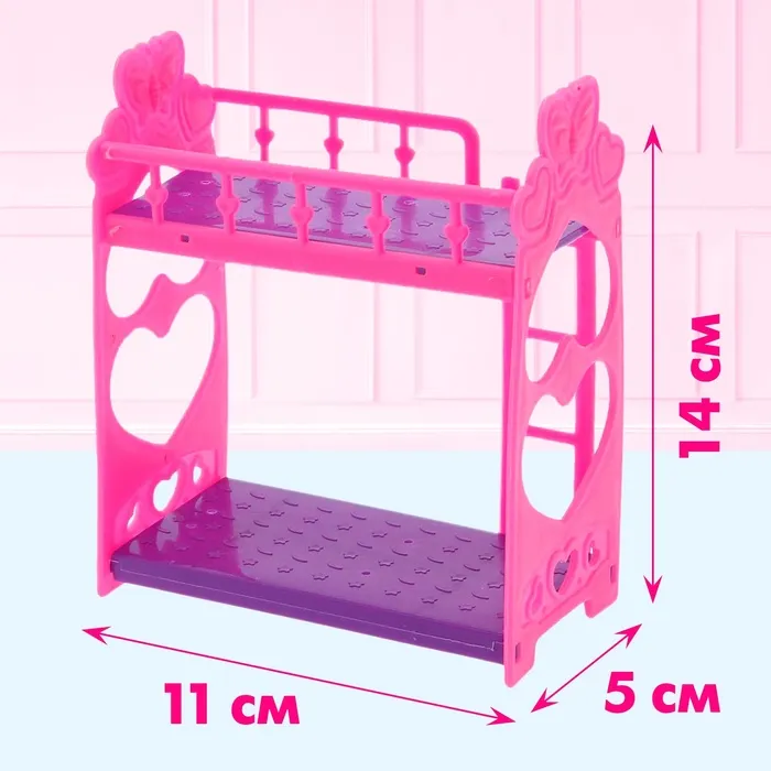 На двухъярусную кроватку можно положить двух кукол одновременно. Игрушка легко собирается. Размер кроватки: 11.5 × 5 × 14 см.