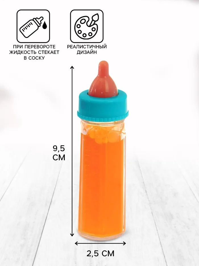- Бутылочка создаёт эффект исчезающей жидкости — при переворачивании она стекает в соску, словно кукла действительно выпила содержимое.