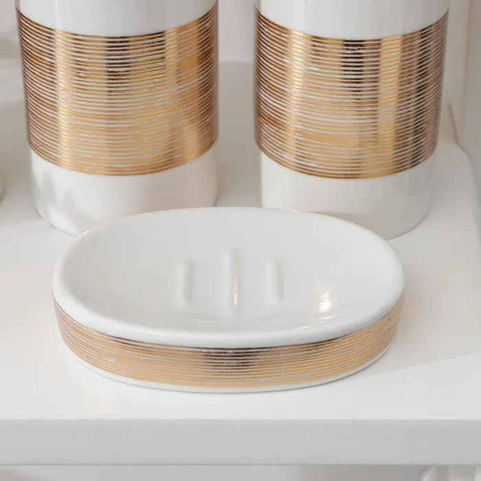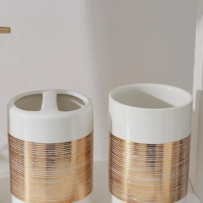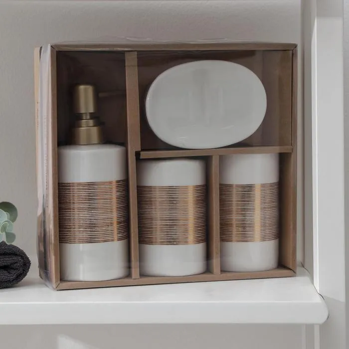 Набор аксессуаров организует пространство и станет стильным украшением Вашей ванной комнаты. За счет сдержанного дизайна данный керамический набор в ванную подойдет к любому дизайну ванной комнаты. Набор состоит из 4 предметов: 2 стакана, мыльница, дозатор.