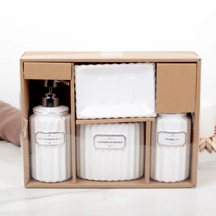 Набор аксессуаров организует пространство и станет стильным украшением Вашей ванной комнаты. За счет сдержанного дизайна данный керамический набор в ванную подойдет к любому дизайну ванной комнаты. Набор состоит из 4 предметов: 2 стакана, мыльница, дозатор.