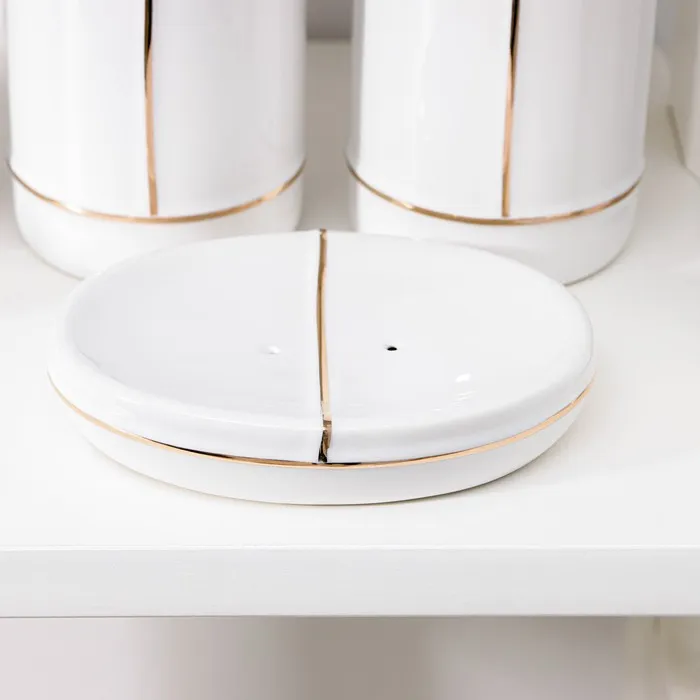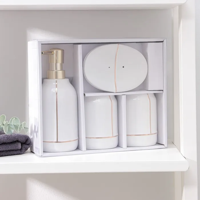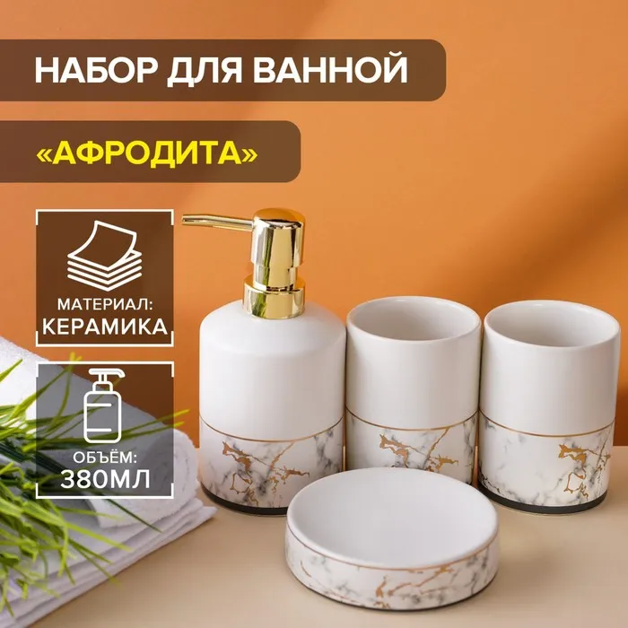 Набор аксессуаров организует пространство и станет стильным украшением Вашей ванной комнаты. За счет сдержанного дизайна данный керамический набор в ванную подойдет к любому дизайну ванной комнаты. Набор состоит из 4 предметов: 2 стакана, мыльница, дозатор.