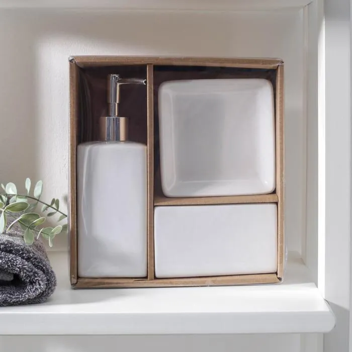 Погрузитесь в мир уюта и стиля с элегантным набором аксессуаров для ванной, который придаст вашему интерьеру свежесть и современность. Этот набор в чистом белом цвете включает в себя мыльницу, дозатор для жидкого мыла объёмом 350 мл и стакан, идеально вписывающиеся в любое пространство.