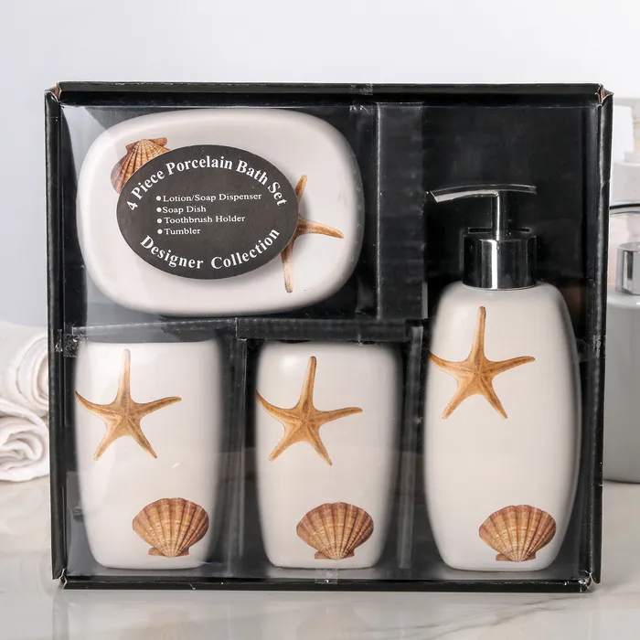 Аксессуары для ванной «Море», 4 предмета: дозатор 300 мл, мыльница, 2 стакана, бежевые — Характеристики
