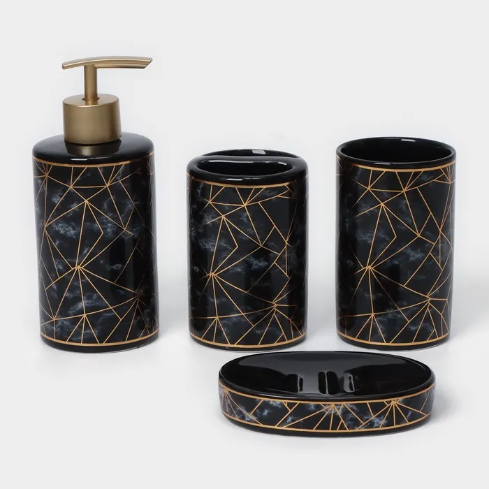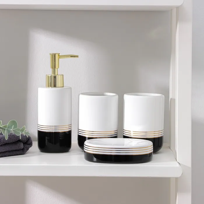 Набор аксессуаров организует пространство и станет стильным украшением Вашей ванной комнаты. За счет сдержанного дизайна данный керамический набор в ванную подойдет к любому дизайну ванной комнаты. Набор состоит из 4 предметов: 2 стакана, мыльница, дозатор.