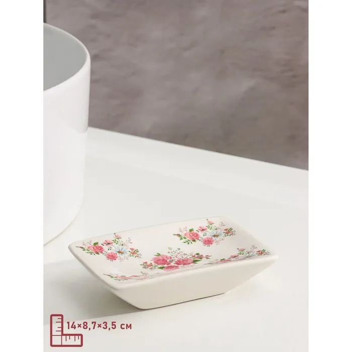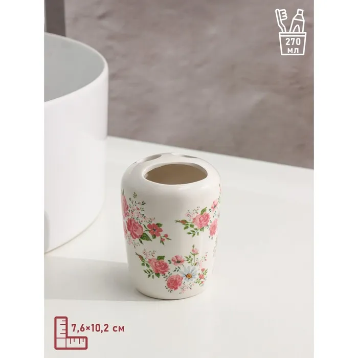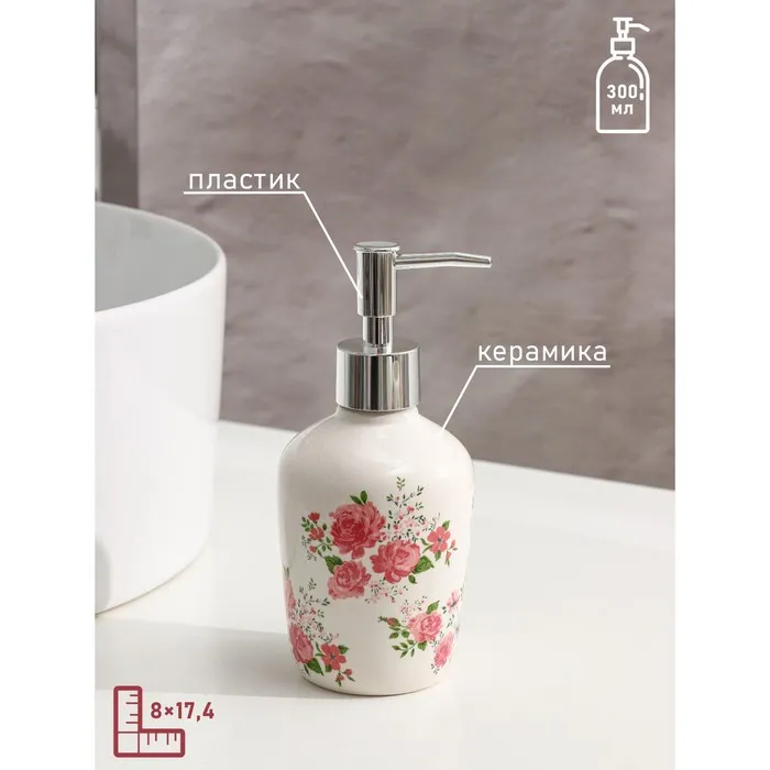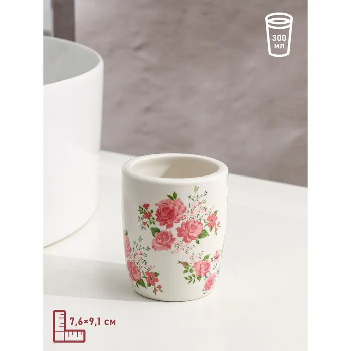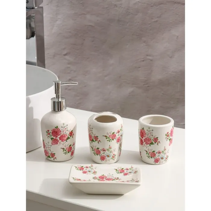 Аксессуары для ванной «Розовые розы», 4 предмета, дозатор 300 мл, мыльница, 2 стакана, белые — Характеристики