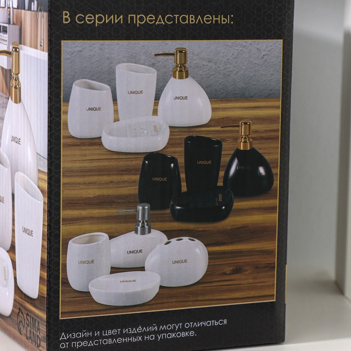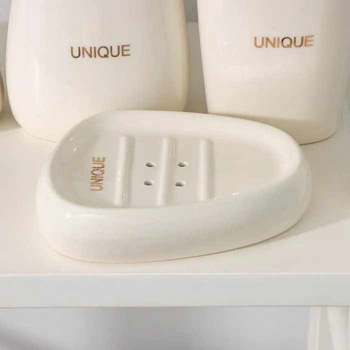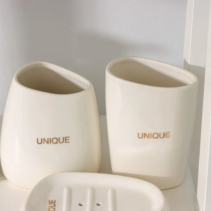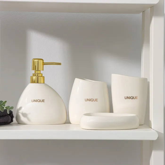 Каждый элемент набора продуман до мелочей: мыльница размером 13х10х2,9 см, дозатор для мыла объемом 400 мл и два стакана различных размеров (410 мл и 300 мл), которые идеально дополняют друг друга, создавая гармоничный ансамбль.