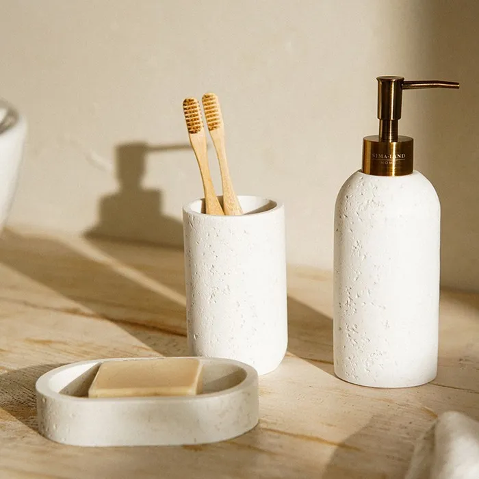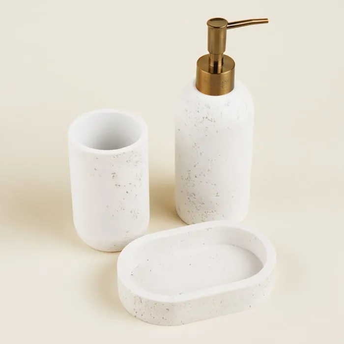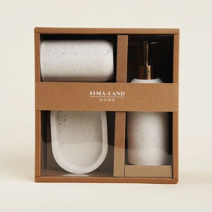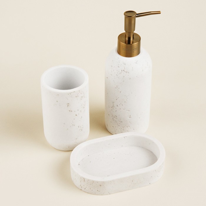 - Комфорт в использовании: дозатор удобен для распределения жидкого мыла, мыльница надёжно удерживает мыло, а стакан идеально подходит для зубных щёток.