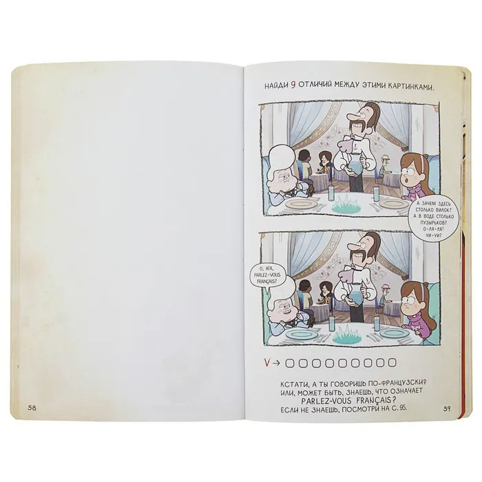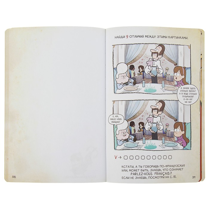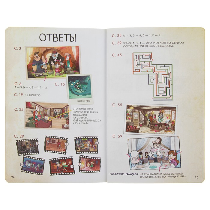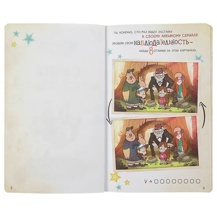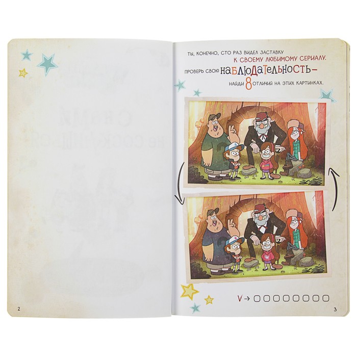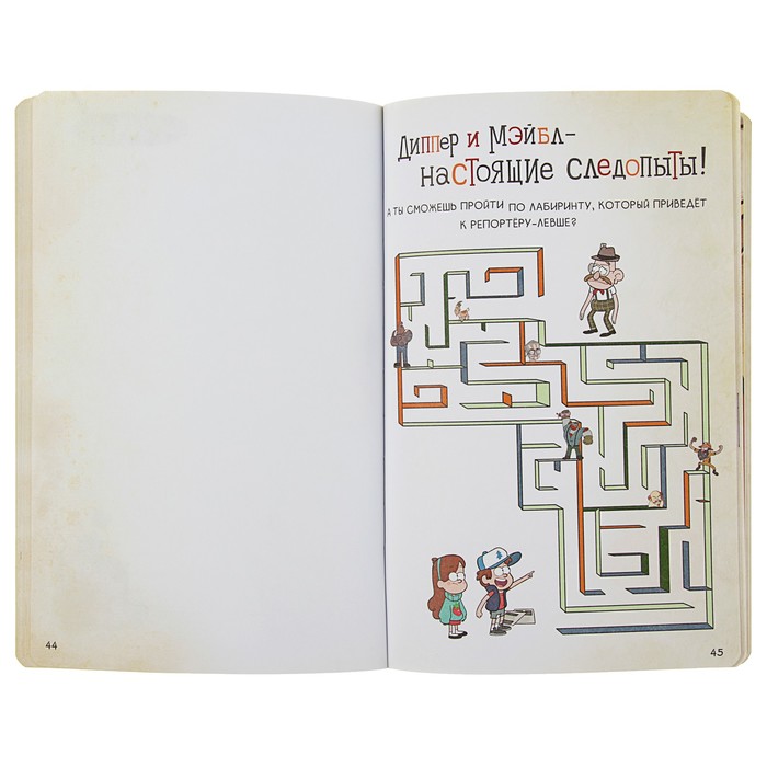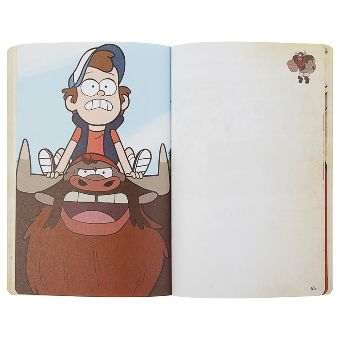 Это не просто блокнот — это целый мир развлечений вместе с любимыми героями Гравити Фолз: лабиринты, головоломки, раскраски и много страниц для своих заметок, рисунков и прочего. На каждой странице — герои сериала и их забавные фразочки.