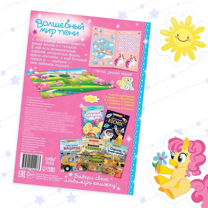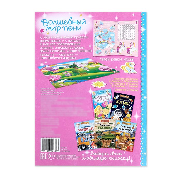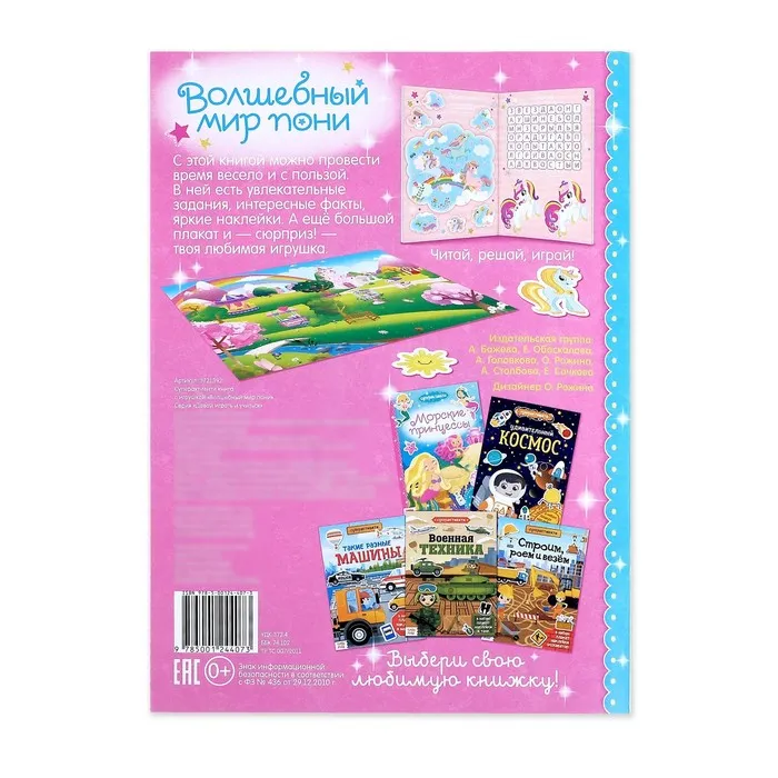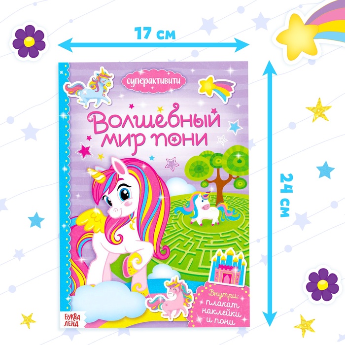 Внутри есть увлекательные задания, интересные факты, яркие наклейки. А ещё большой плакат и сюрприз — миниатюрная игрушка в виде сказочного пони.