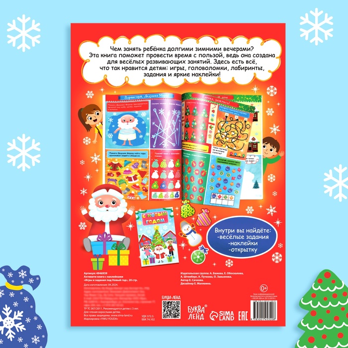 Внутри малыш найдёт игры, головоломки, лабиринты, задания и более 120 ярких наклеек. А также сможет украсить открытку любыми стикерами из набора, которые ему понравятся.