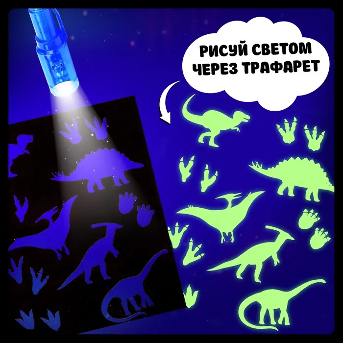 Ребёнок рисует специальной ручкой, а рисунки становятся видимыми только под светом фонарика. Это создаёт эффект магии и вовлекает в процесс. Можно рисовать на страницах, оставлять послания или разгадывать спрятанные изображения.