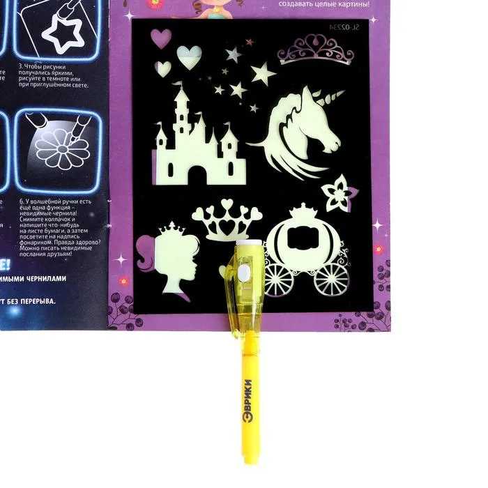 - Создавайте рисунки с помощью невидимых чернил или световой ручки из набора.