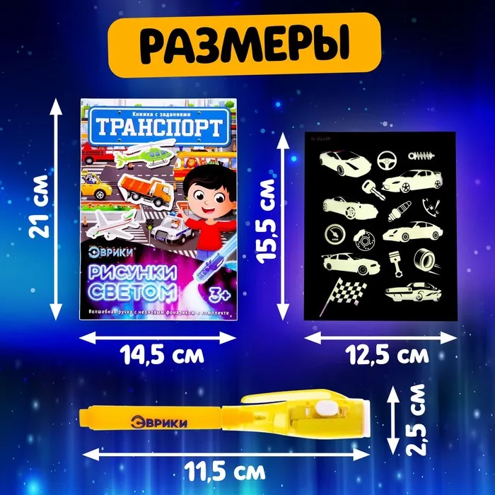 Активити-книжка с рисунками светом «Транспорт», ручка с фонариком и невидимыми чернилами — Характеристики