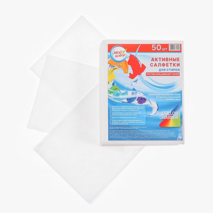 Активные салфетки для стирки «Мой выбор» препятствуют окрашиванию тканей и дают возможность стирать белую и разноцветную одежду вместе. Краски остаются яркими и насыщенными, чёрное — чёрным, а белое — белым.