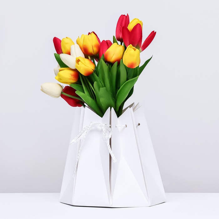 • Букет в такой упаковке сохраняет вертикальное положение, поэтому его удобно устроить в салоне автомобиля, а в помещении он может стоять на столе без вазы.