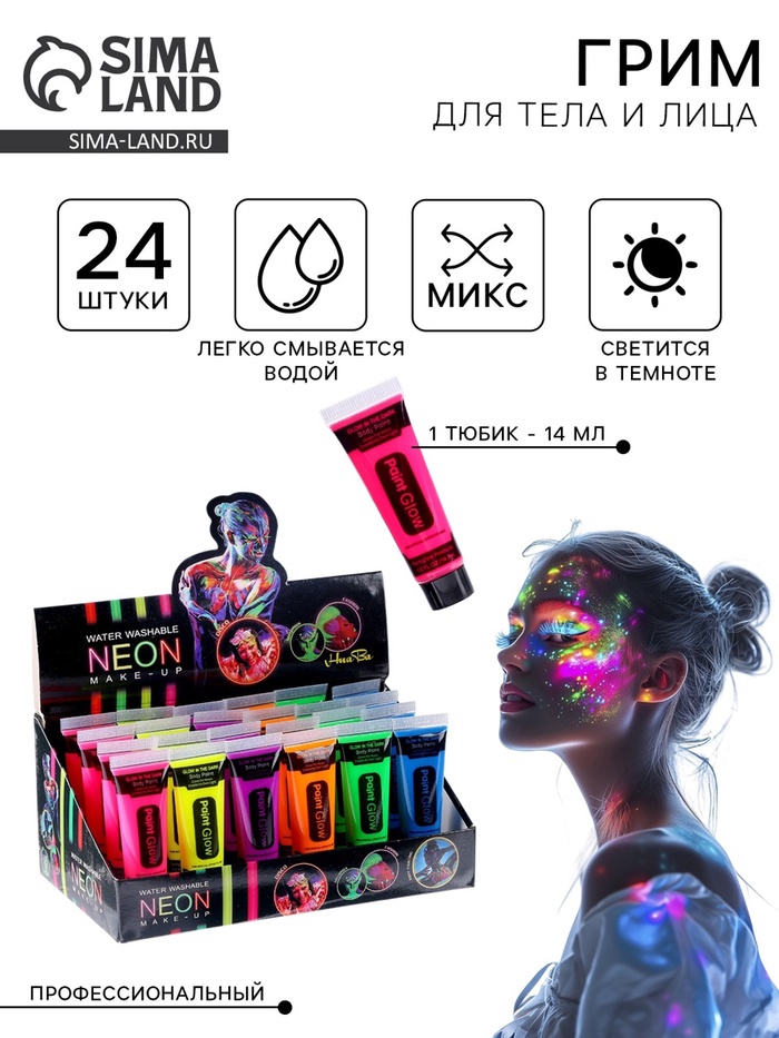 Грим для лица, неон, светится ночью, 14 мл., МИКС