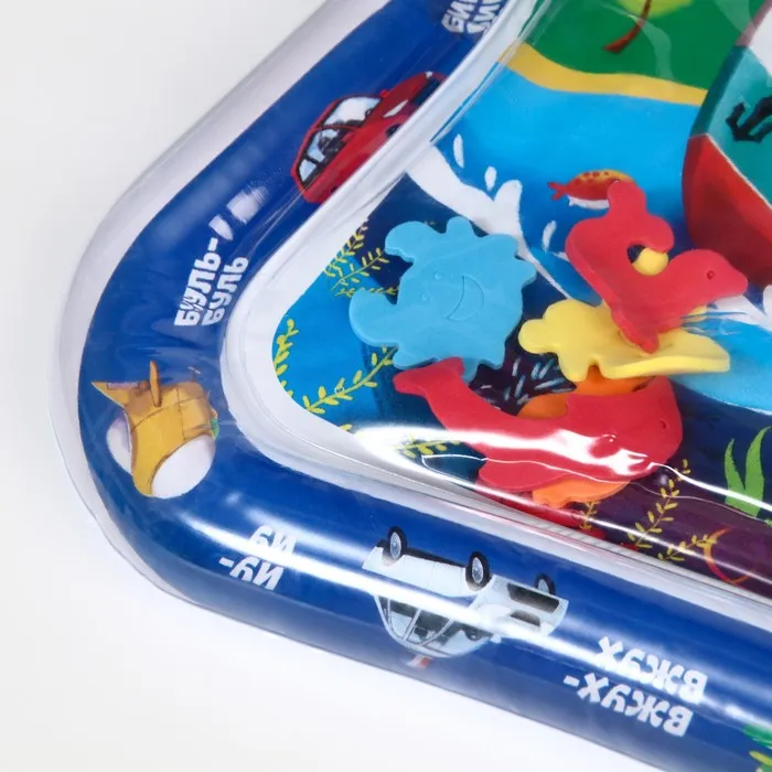 Водный коврик представляет собой прозрачный матрас для детей, разделенный на независимые друг от друга отсеки. Один отсек игрового коврика заполняется водой, а второй – воздухом, превращаясь в бортики.
