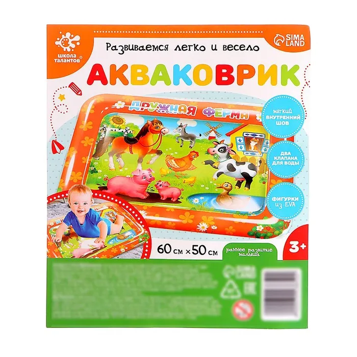 Акваковрик «Дружная ферма» надолго увлечёт вашего малыша и разнообразит его досуг. Ребёнку будет интересно наблюдать за фигурками в коврике. Для того чтобы надуть коврик вам не потребуется насос, просто наполните его водой на ваше усмотрение. Акваковрик компактно складывается. Его легко взять с собой на пикник, в гости или в путешествие.