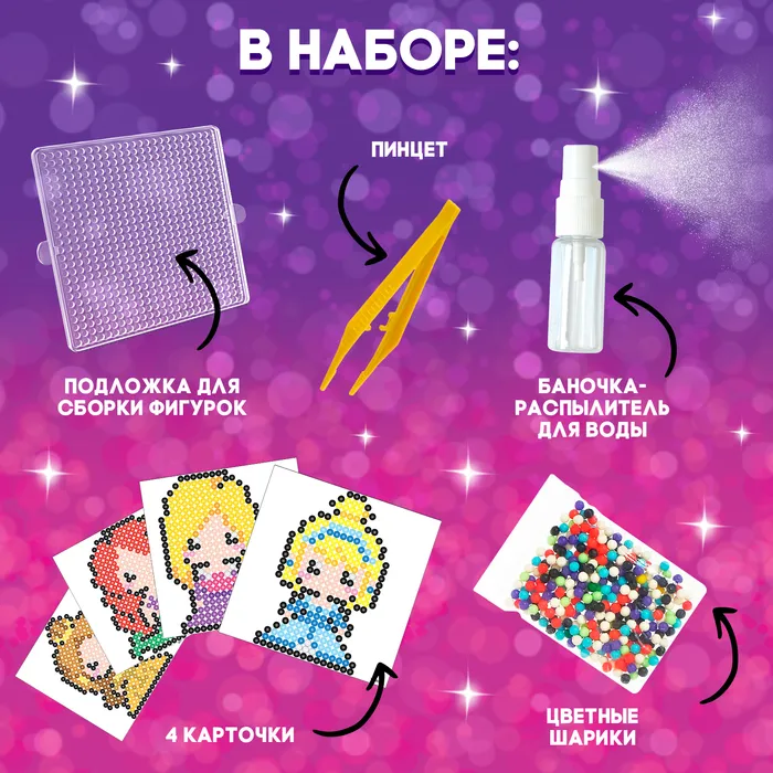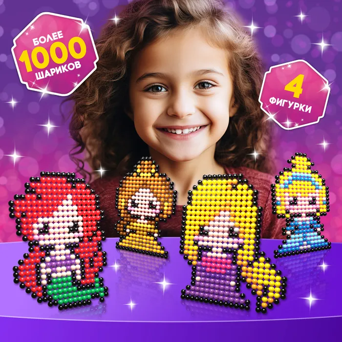 С аквамозаикой «Принцессы» ребёнок соберёт из шариков-пикселей 4 объёмных фигурки, потренирует мелкую моторику и внимание. С поделками можно играть или украсить интерьер.