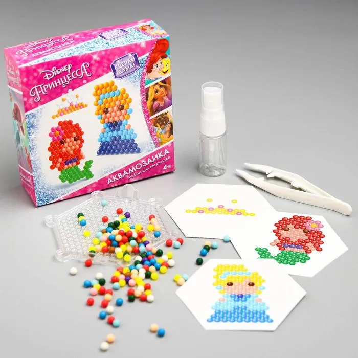 С аквамозаикой «Ариэль и Золушка» ребёнок соберёт из шариков-пикселей 3 объёмных фигурки. С поделками можно играть или украсить интерьер.