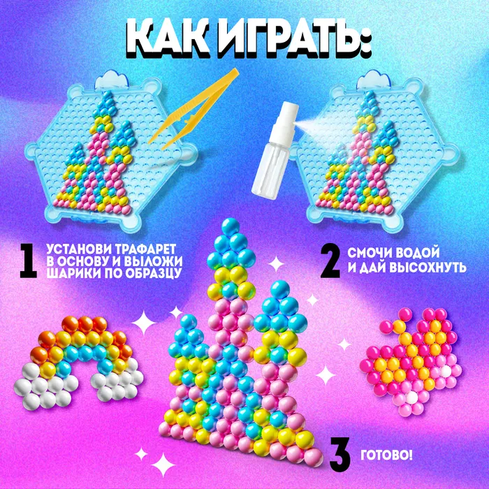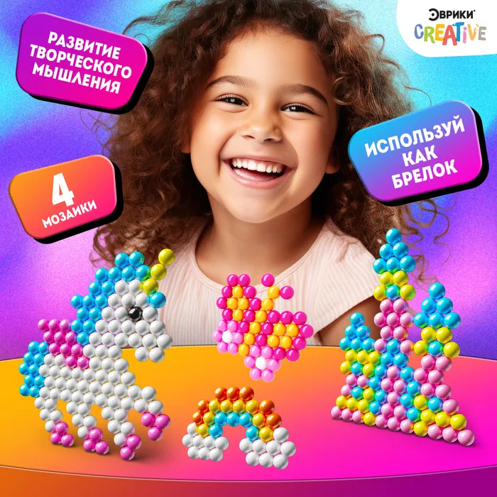 С аквамозаикой от торговой марки «Эврики» ребёнок соберёт объёмные фигурку из цветных бусинок. Детали плотно скрепляются друг с другом. Из бисера можно сделать интересную аппликацию на красочном фоне.