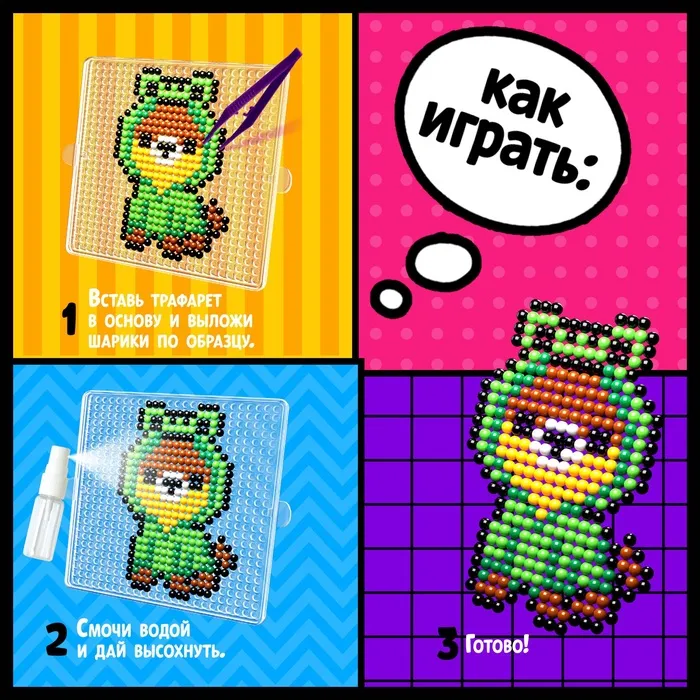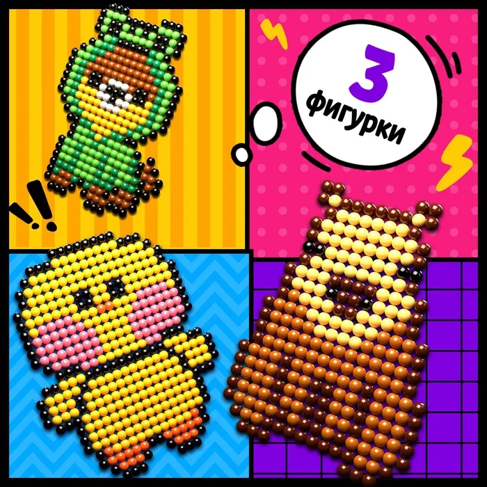С аквамозаикой «Зверята» ребёнок соберёт 3 объёмные фигурки из шариков-пикселей. Детали плотно скрепляются друг с другом. С поделками можно играть или украсить интерьер.