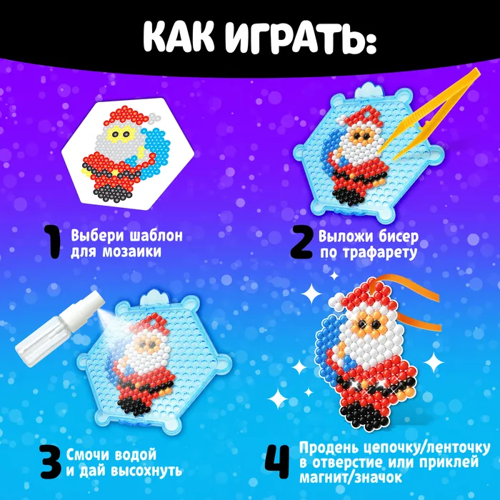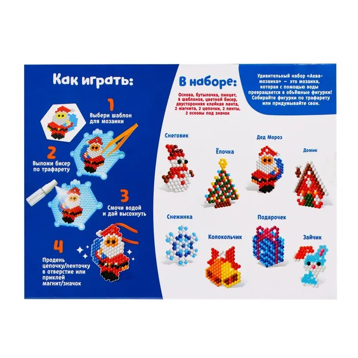 Аквамозаика от торговой марки «Эврики» скрасит дни в ожидании Нового года и поможет весело и с пользой провести время. Ребёнок соберёт 8 объёмных фигурок из шариков-пикселей, потренирует мелкую моторику и внимание.