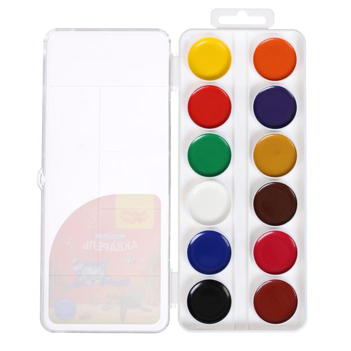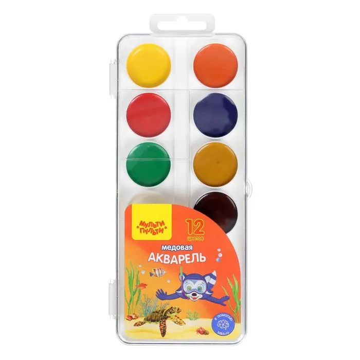 Акварель безопасна для детей. Удобный пластиковый пенал, крышка плотно фиксируется и служит палитрой для смешивания красок.