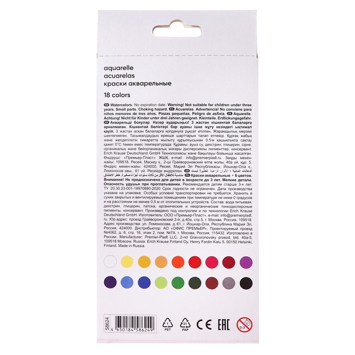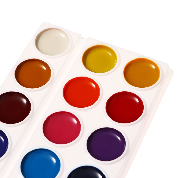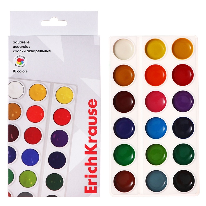 Классические акварельные полусухие краски в облегченной пластиковой палетке без крышки, представлены в картонной упаковке с хидером.