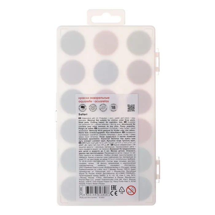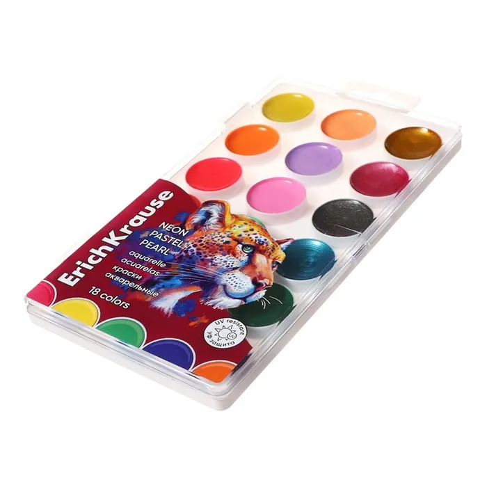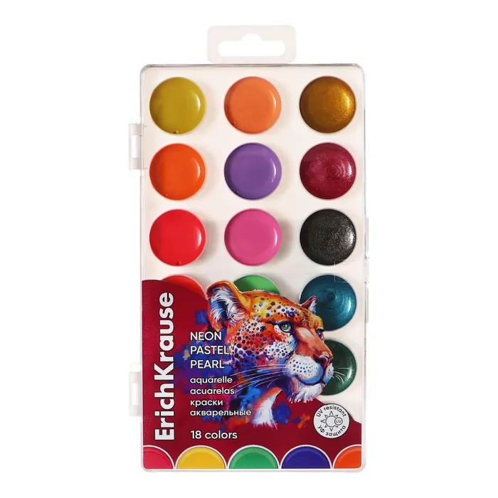 Акварель 18 цветов, ErichKrause Safari – это качественные полусухие краски с УФ-защитой, которые не выгорают на солнце. Набор из 18 ярких неоновых, пастельных и перламутровых оттенков в пластиковой коробке с европодвесом.